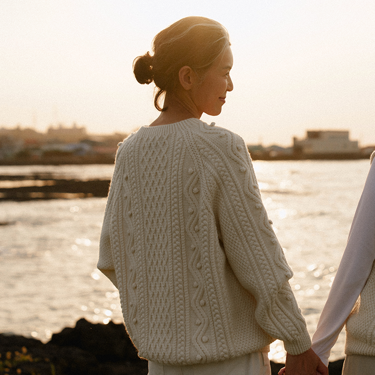앞, 뒤, 옆 전체에 풍성하게 표현되는 아란 무늬, 어깨선에서 소매, 뒤판으로 연결되는 매끄러운 이음새와 입체감은 한림수직만의 품질력을 보여주는 부분입니다. 조금 더 번거롭고 어려운 방식일지라도 한림수직은 ‘품질은 생명’이라는 미션을 따르며 까다로운 방식을 선택합니다.